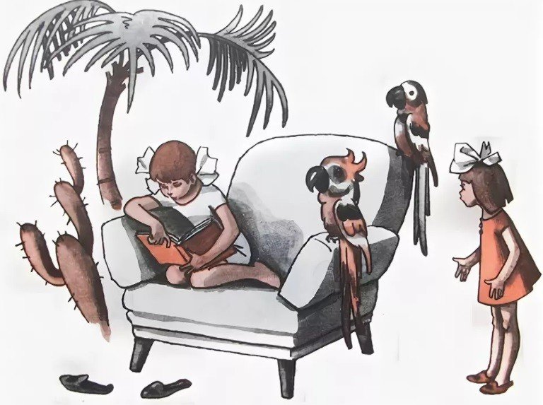 Мама попросила дочерей помочь вымыть посуду. Оля сразу пошла на кухню, пообещав вернуться к лепке, а Наташа, увлечённая книгой о путешествиях по Африке, сказала, что присоединится позже. Оля напомнила Наташе, что они почти закончили, но та, погружённая в книгу, ответила, что "путешествует" в Конго. Через двадцать минут Оля убрала чистые тарелки и вернулась к лепке. Наташа, дочитав книгу, заметила, что Оля вымазала губы. Оля рассказала, что съела два пирожных, одно за себя и одно за Наташу, по просьбе мамы, чтобы пирожное не испортилось. |