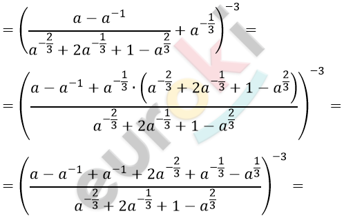 \[= \left( \frac{a - a^{- 1}}{\left( a^{- \frac{1}{3}} + 1 \right)^{2} - a^{\frac{2}{3}}} + a^{- \frac{1}{3}} \right)^{- 3} =\]