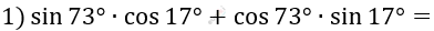 \[= \sin(73{^\circ} + 17{^\circ}) = \sin{90{^\circ}} = 1\]
