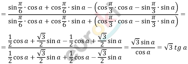\[\frac{\sin\left( \frac{\pi}{6} + a \right) - \cos\left( \frac{\pi}{3} + a \right)}{\sin\left( \frac{\pi}{6} + a \right) + \cos\left( \frac{\pi}{3} + a \right)} =\]