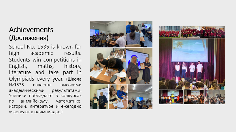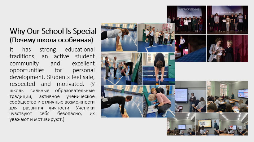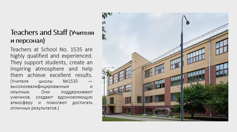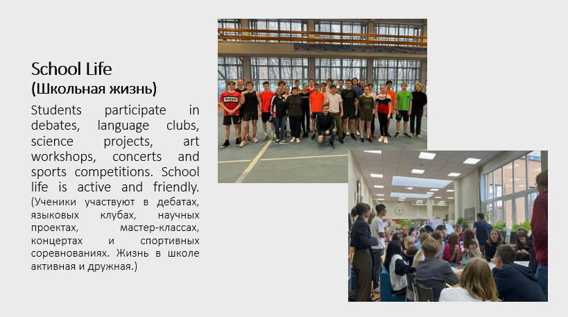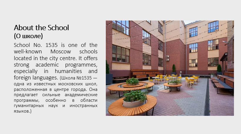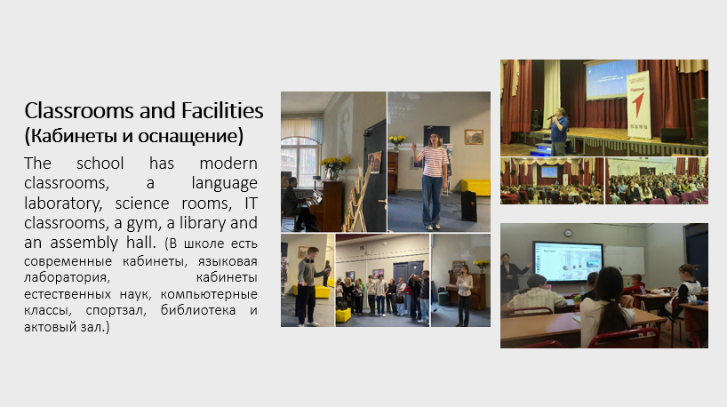 | 5) subjects taught (Преподаваемые предметы) | A broad curriculum including Maths, Russian Language, Literature, History, Social Studies, Sciences (Physics, Chemistry, Biology), Foreign Languages (usually English), and Physical Education. (Широкий учебный план, включающий Математику, Русский Язык, Литературу, Историю, Обществознание, Естественные науки (Физику, Химию, Биологию), Иностранные языки (обычно английский) и Физическое воспитание.) |