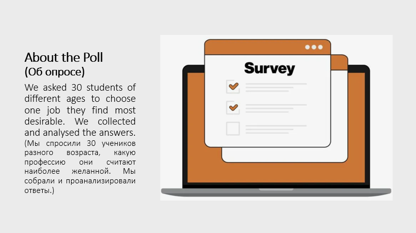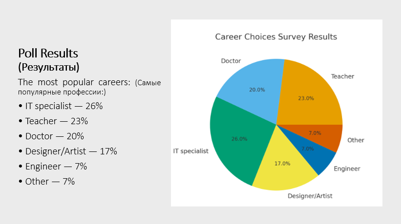According to our poll, the most desirable career among students in our school is IT specialist. Teaching and medicine are also highly popular. The results show that students prefer modern and useful professions that offer good opportunities. (Согласно нашему опросу, самая желанная профессия среди школьников — айти-специалист. Учитель и врач также очень популярны. Результаты показывают, что ученики предпочитают современные и полезные профессии, дающие хорошие возможности.)