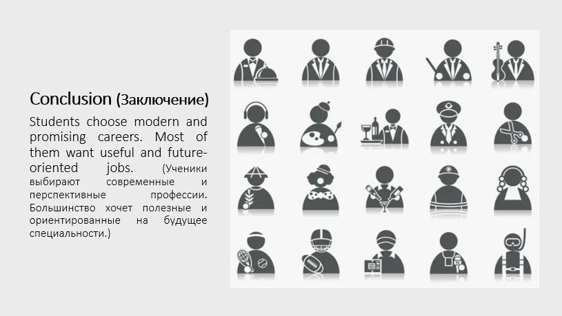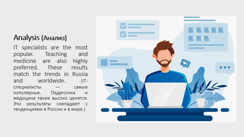 Добавить текст Озвучить Вернуть оригиналIn Russia, some of the most popular careers among young people are IT specialists, doctors and teachers. Our results are similar, because most students also chose IT, medicine and teaching. (В России одними из самых популярных профессий среди молодёжи являются айти-специалисты, врачи и учителя. Наши результаты похожи, так как большинство учащихся также выбрали IT, медицину и педагогику.)