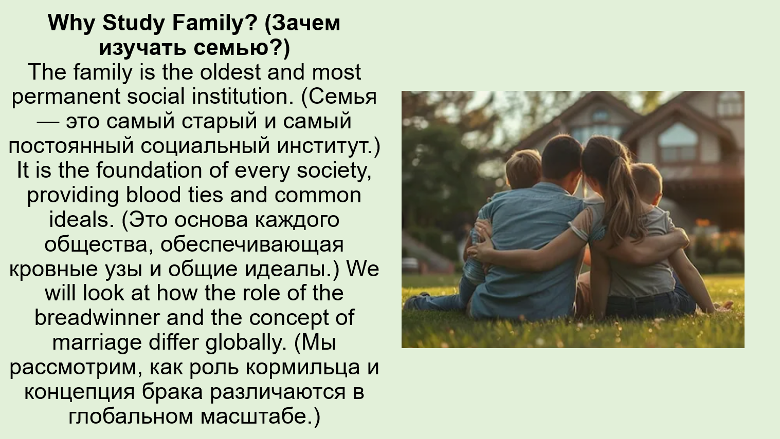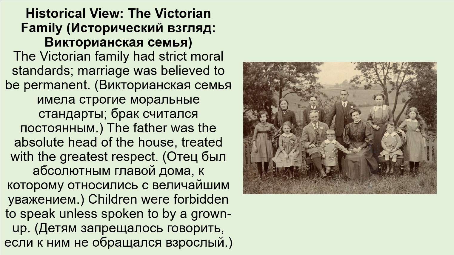Find some information about what families were like in different periods in history or about the specific features of family and marriage in different cultures. Think of how to present it in the class in the most interesting way. Give your presentation. Remember that it shouldn't exceed 5–7 minutes. Decide whose presentation is the best and why. (Найдите информацию о том, какими были семьи в разные периоды истории или об особенностях семьи и брака в разных культурах. Подумайте, как представить ее в классе наиболее интересным способом. Сделайте свою презентацию. Помните, что она не должна превышать 5–7 минут. Решите, чья презентация лучшая и почему.)
