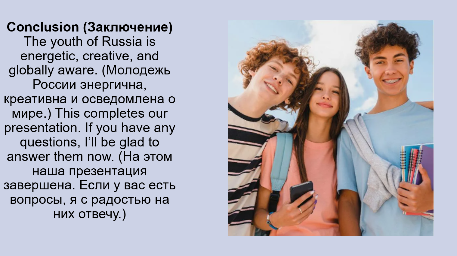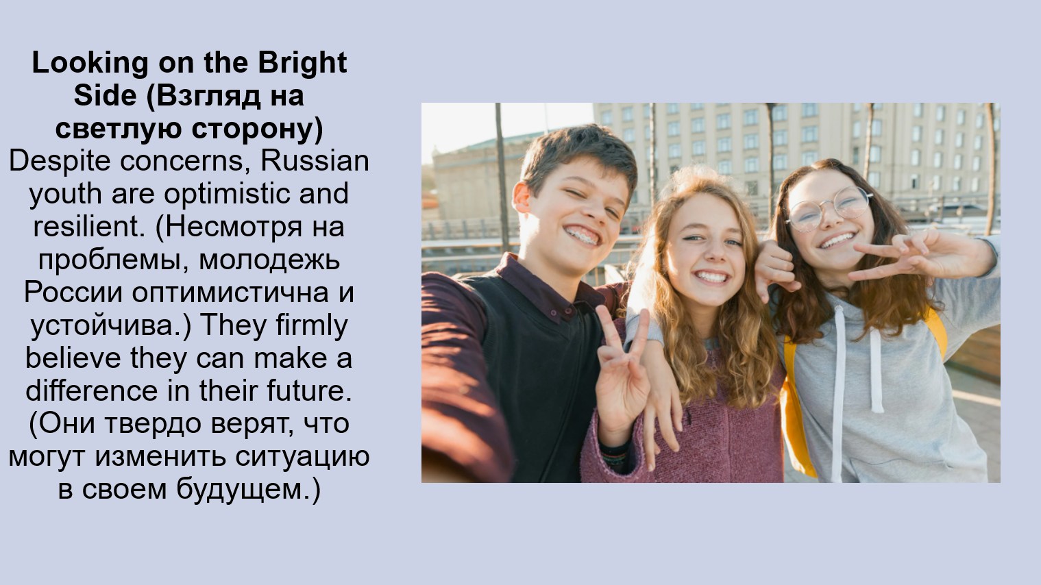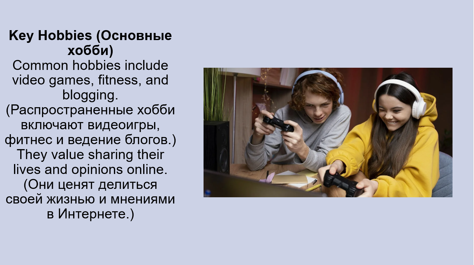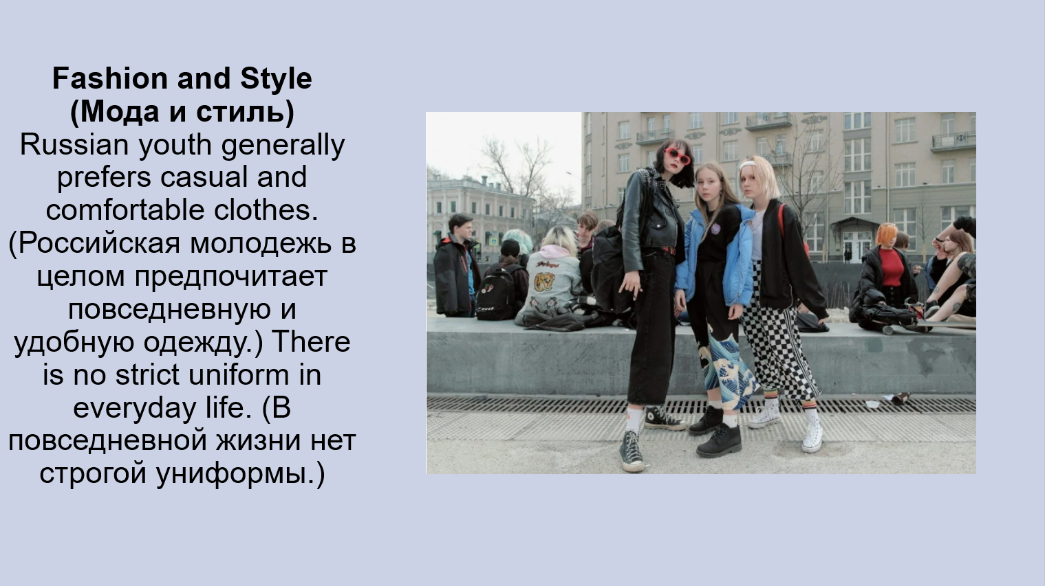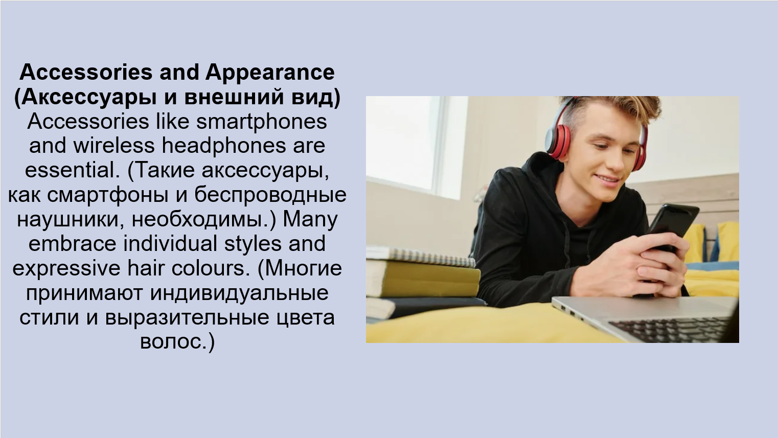 Clothes, accessories, hairstyles: Young people in Russia wear casual clothes (повседневную одежду), often following global trends (следуя мировым тенденциям). (Молодежь в России носит повседневную одежду, часто следуя мировым тенденциям.) They love accessories (любят аксессуары) like earphones (наушники) and smartwatches (умные часы).