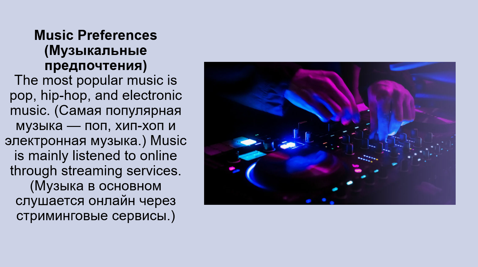 Добавить текст Вернуть оригиналMusic they enjoy: They enjoy pop, hip-hop, and electronic dance music (поп, хип-хоп и электронную танцевальную музыку), which is often listened to online (онлайн).
