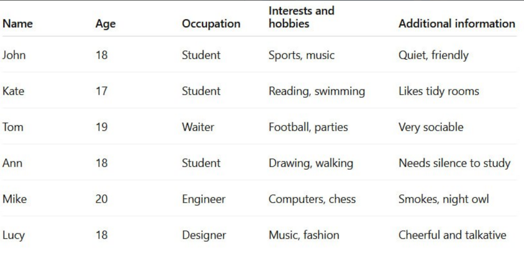 Room 1: John and Tom — both like sports and are sociable. (Комната 1: Джон и Том — оба любят спорт и общительны.)