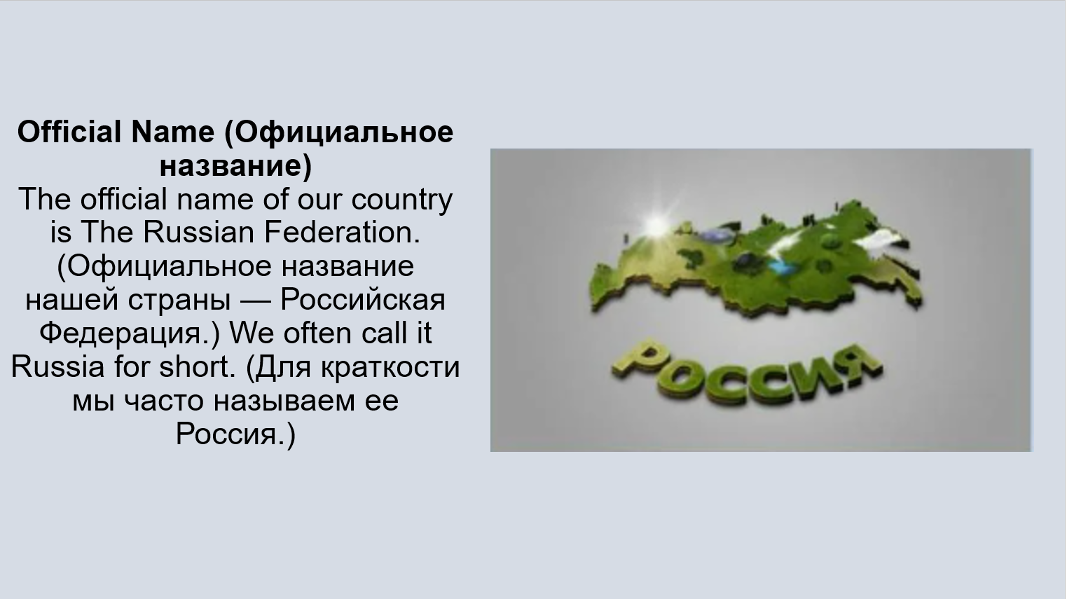 Добавить текст Вернуть оригиналRussia: Official - The Russian Federation. Geographical - Russia. (Официальное - Российская Федерация. Географическое - Россия.)