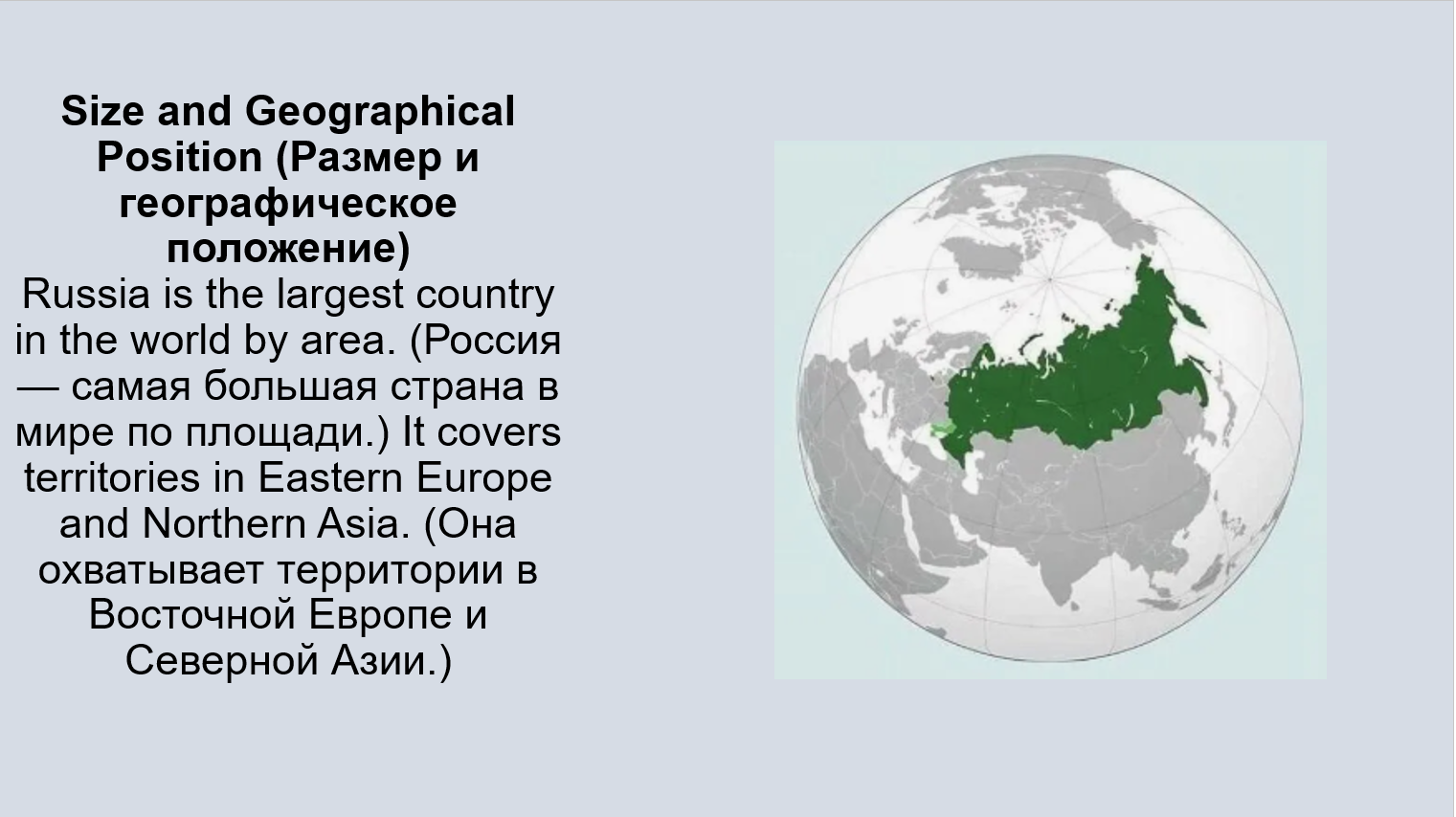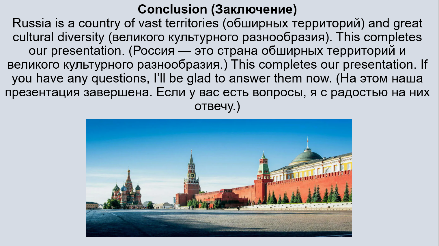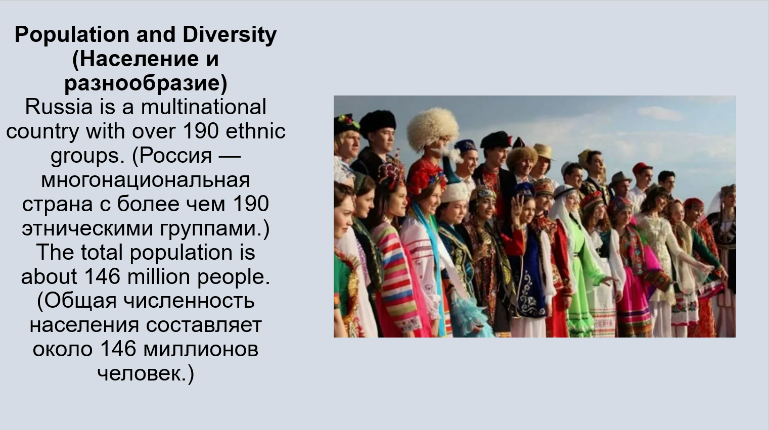 Добавить текст Вернуть оригинал94. Find out more about why our Motherland was originally called Great Rus'. Do you think 'Rus' is a poetic or a historic name for our country? Does it sound respectful and proud at the same time? Write one or two paragraphs about our country according to the example. (Узнайте больше о том, почему наша Родина изначально называлась Великая Русь. Считаешь ли ты, что «Русь» — это поэтическое или историческое название для нашей страны? Звучит ли оно одновременно уважительно и гордо? Напишите один или два абзаца о нашей стране по примеру.)