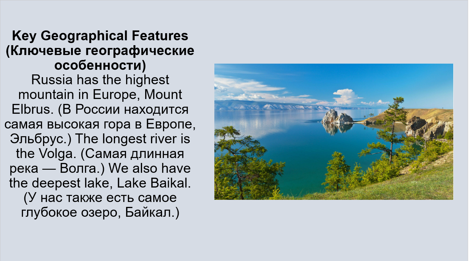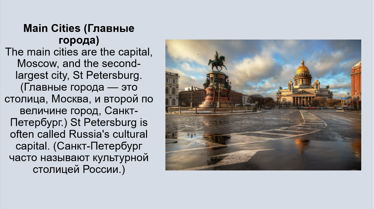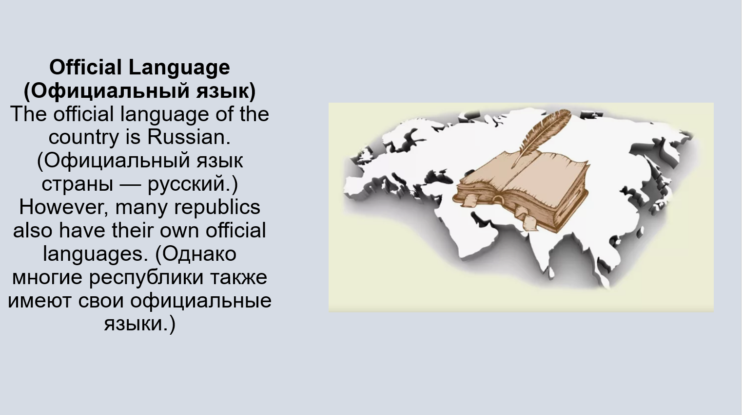 Добавить текст Вернуть оригинал94. Find out more about why our Motherland was originally called Great Rus'. Do you think 'Rus' is a poetic or a historic name for our country? Does it sound respectful and proud at the same time? Write one or two paragraphs about our country according to the example. (Узнайте больше о том, почему наша Родина изначально называлась Великая Русь. Считаешь ли ты, что «Русь» — это поэтическое или историческое название для нашей страны? Звучит ли оно одновременно уважительно и гордо? Напишите один или два абзаца о нашей стране по примеру.)