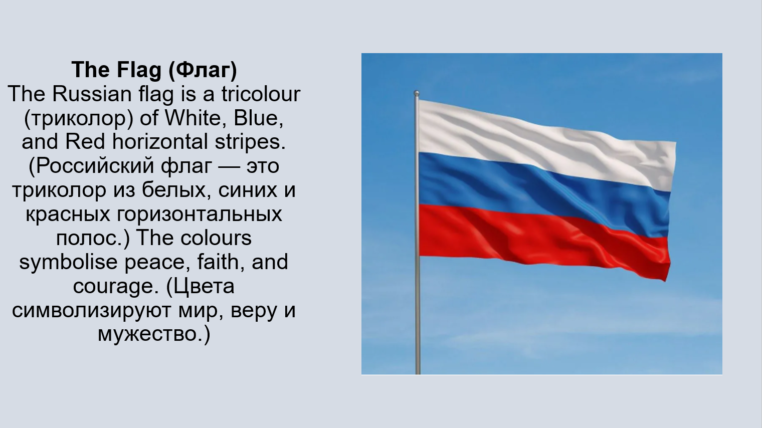 Добавить текст Вернуть оригиналThe Russian Flag is White, Blue, and Red. (Российский флаг — белый, синий и красный.)