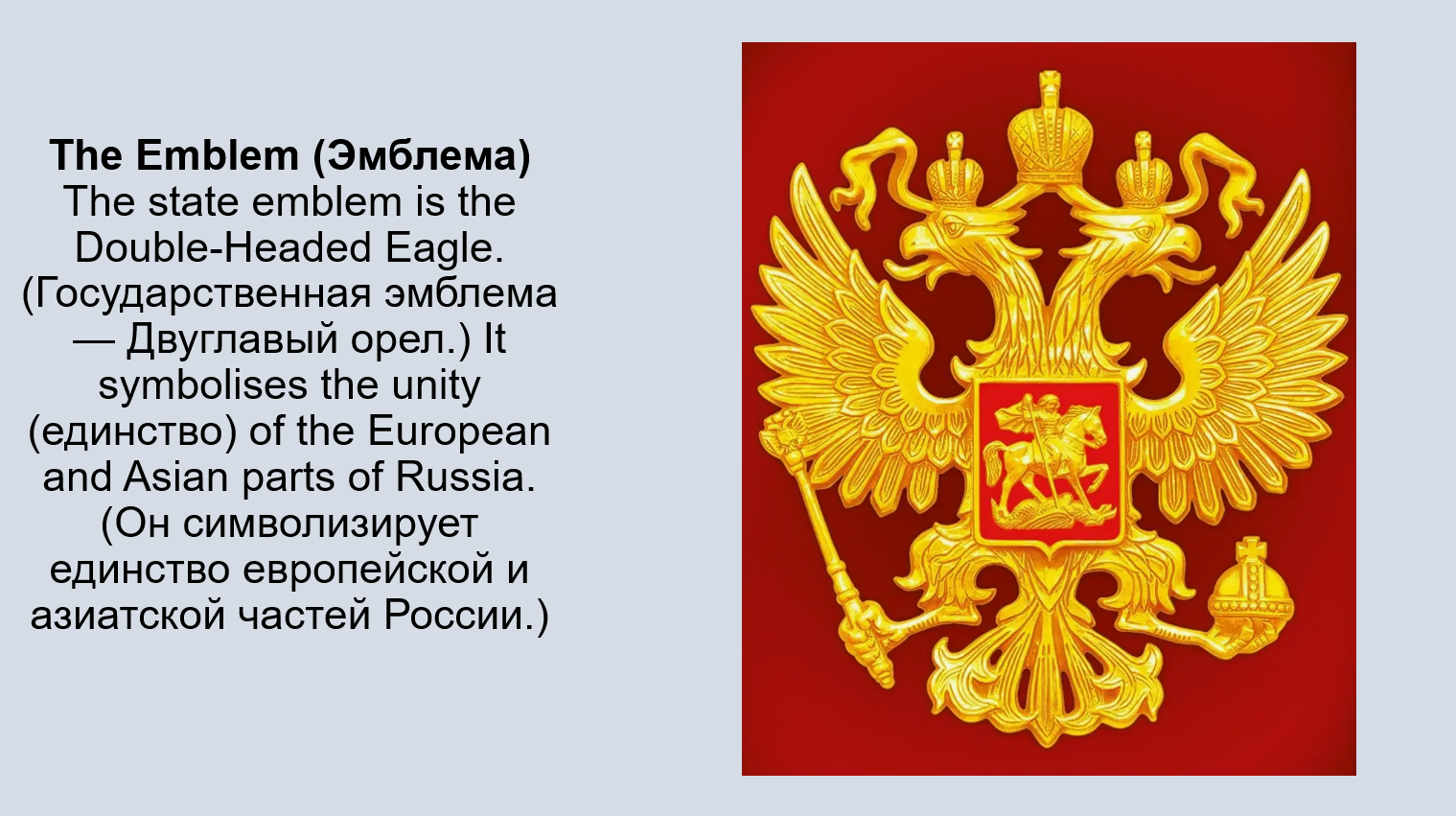 Добавить текст Вернуть оригиналYes. The British emblem is the Red Rose (Красная роза); the American emblem is the Bald Eagle (Белоголовый орлан); the Russian emblem is the Double-Headed Eagle (Двуглавый орел).