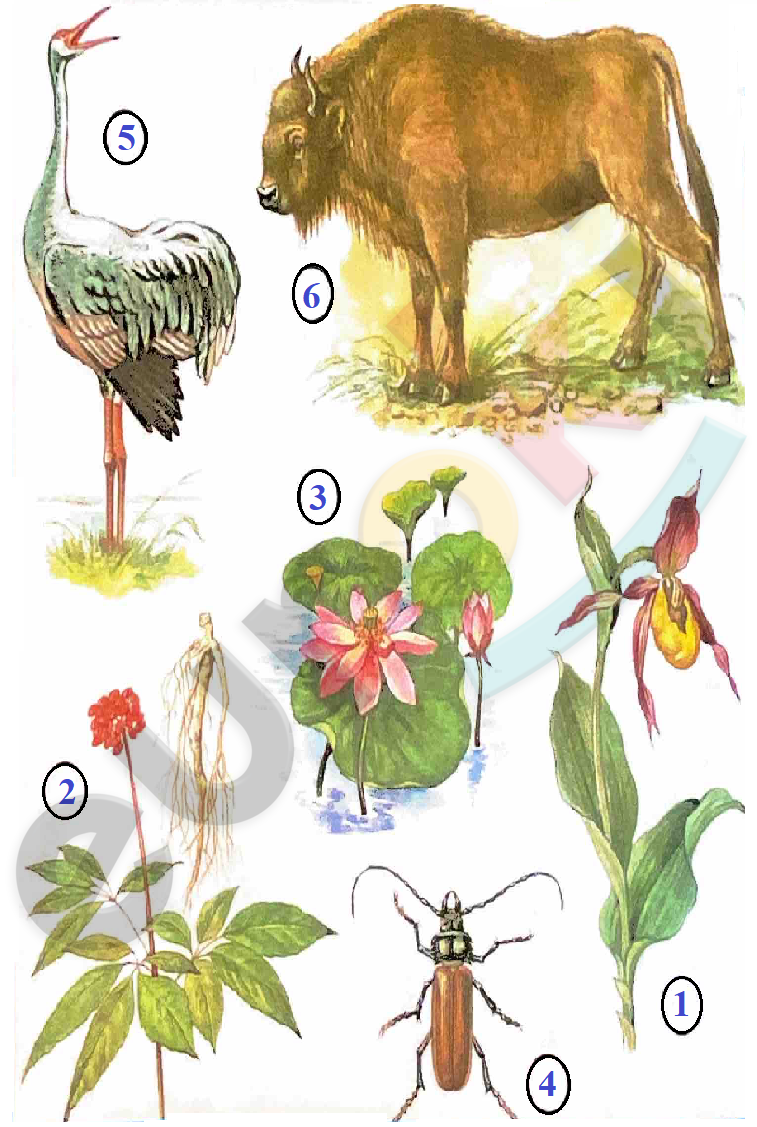 Добавить текст Вернуть оригинал1. Венерин башмачок. 2. Женьшень. 3. Лотос. 4. Дровосек реликтовый. 5. Белый журавль. 6. Зубр.