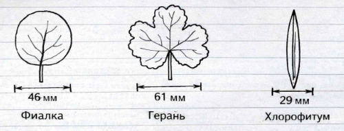 1) Пользуясь информацией на с. 37 учебника, измерьте ширину листьев нескольких растений в кабинете биологии. Зарисуйте их, указав размеры.