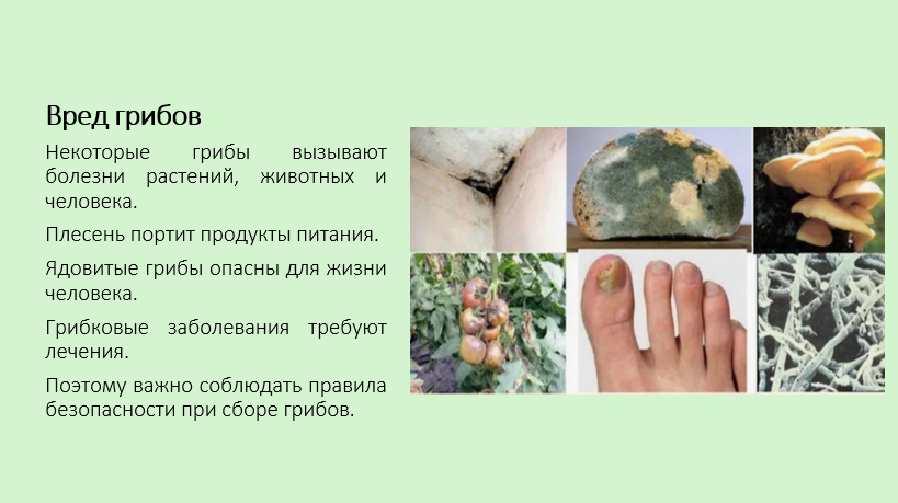 Добавить текст Озвучить Вернуть оригиналГрибы имеют большое значение в жизни человека. Их используют в пищу, в хлебопечении, медицине и производстве продуктов. Однако некоторые грибы опасны, так как являются ядовитыми или вызывают заболевания.
