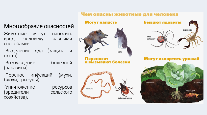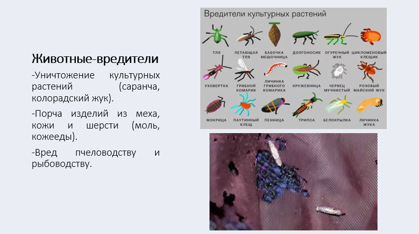 Добавить текст Озвучить Вернуть оригиналПомимо угрозы здоровью, животные могут вредить хозяйственной деятельности. Насекомые-вредители уничтожают культурные растения и запасы зерна, а личинки моли портят изделия из шерсти и кожи. Понимание биологических особенностей этих существ и знание мест их обитания помогают человеку избежать опасных контактов и эффективно защищать свое здоровье и имущество.