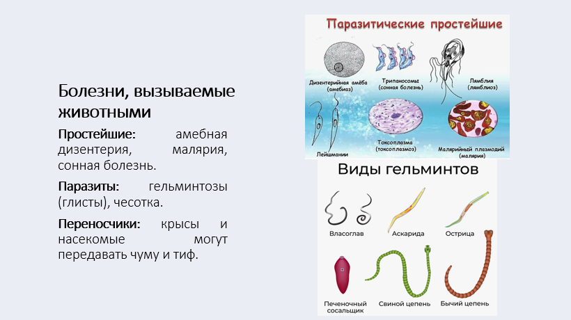 Добавить текст Озвучить Вернуть оригиналОгромный вред приносят паразитические простейшие и животные-переносчики. Дизентерийная амеба и малярийный плазмодий вызывают опасные болезни, такие как дизентерия и малярия. Некоторые насекомые и грызуны являются переносчиками возбудителей чумы и тифа. Также существуют паразиты, например гельминты (глисты) и чесоточный клещ, которые живут непосредственно в организме человека.