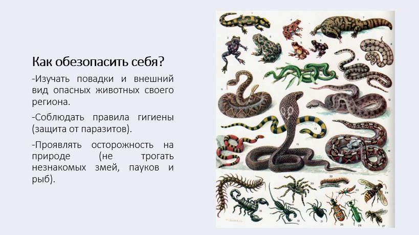 Добавить текст Озвучить Вернуть оригинал2. Ядовитые животные суши. Характеристика опасных паукообразных (тарантул, скорпион) и пресмыкающихся (гадюка).