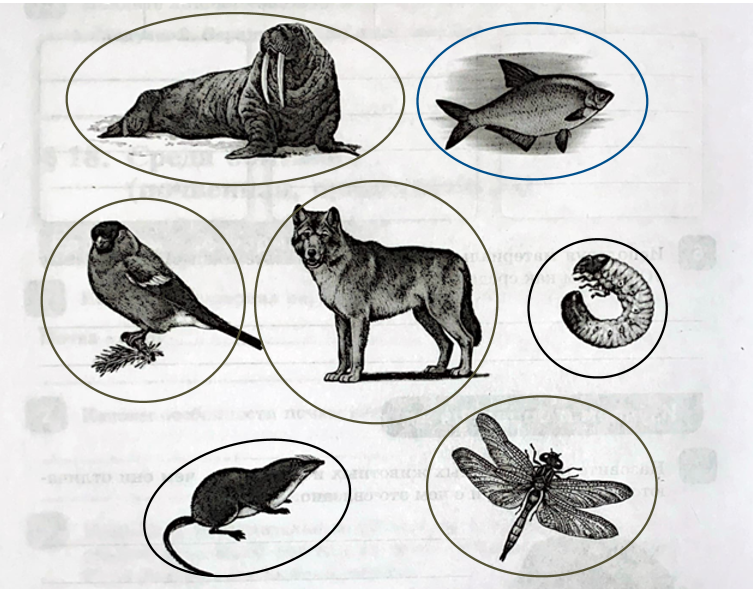 8. Рассмотрите рисунок. Укажите название сред обитания изображённых животных, отметив обитателей водной среды синим карандашом, наземно-воздушной — коричневым, почвенной — чёрным, организменной — красным.