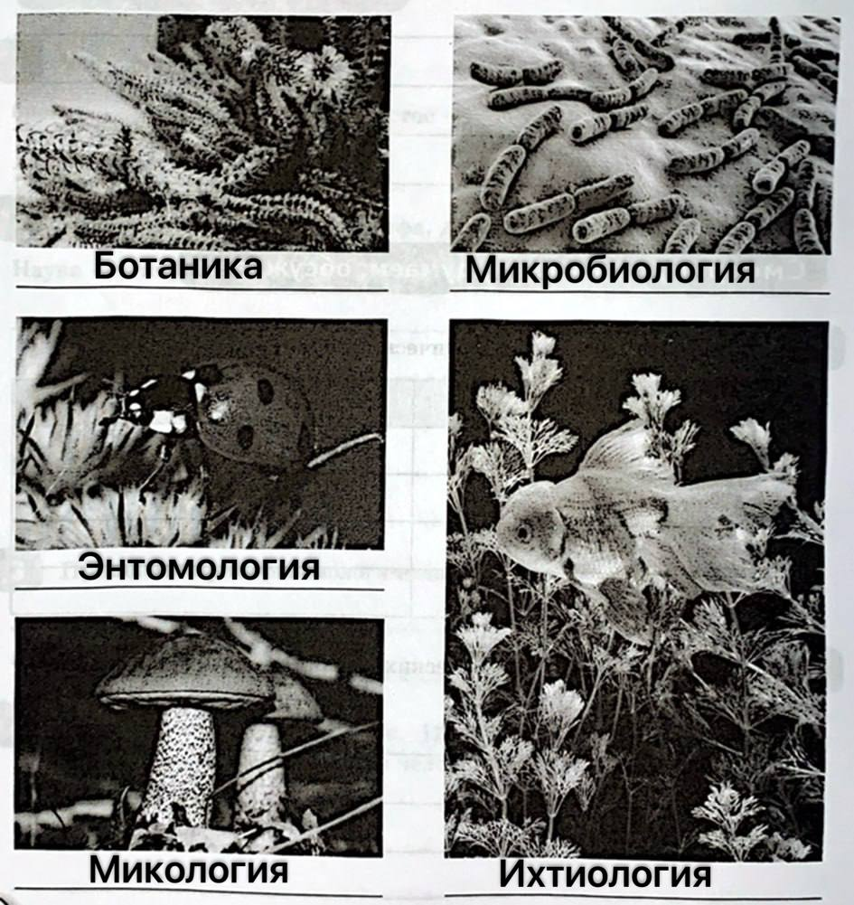 Добавить текст Озвучить Вернуть оригинал9. Рассмотрите фотографии. Укажите названия наук, которые изучают изображённые биологические объекты.