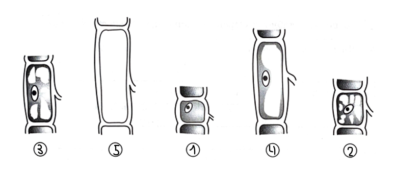 В самой молодой клетке содержится много мелких вакуолей, а ядро располагается в центре.