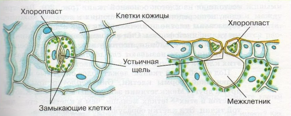 Устьичные клетки отличаются от других клеток кожицы тем, что они располагаются парами, имеют полулунную форму и содержат зеленые пластиды — хлоропласты. Между этими двумя замыкающими клетками находится отверстие — устьичная щель.