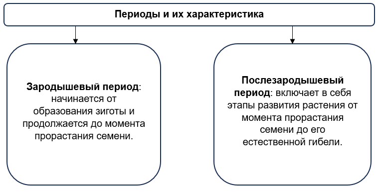 5. Изучив материал параграфа и раздел «Периоды и этапы в индивидуальном развитии покрытосеменных растений», заполните схему. На основе анализа и сравнения полученных данных сделайте вывод.