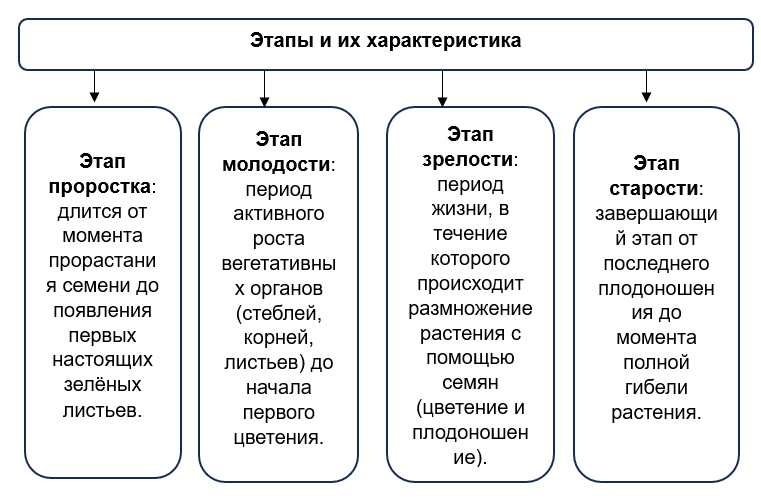Вывод. В ходе анализа индивидуального развития растений можно сделать вывод, что жизнь каждого организма представляет собой строго последовательную смену периодов и этапов, в ходе которых происходят не только количественные изменения (рост), но и важнейшие качественные преобразования тканей и органов.