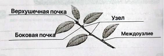 Верхушечная почка находится на самом конце побега и обеспечивает его рост в длину. Узел — это участок стебля, на котором развивается лист и пазушная почка. Пазушная почка располагается в пазухе листа и даёт начало боковым побегам. Междоузлие представляет собой участок стебля между двумя соседними узлами.
