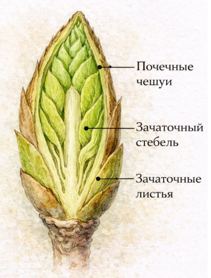 Добавить текст Озвучить Вернуть оригиналПри изучении вытянутой почки внутри обнаружены зачатки стебля и листьев. Такая почка называется вегетативной (листовой).