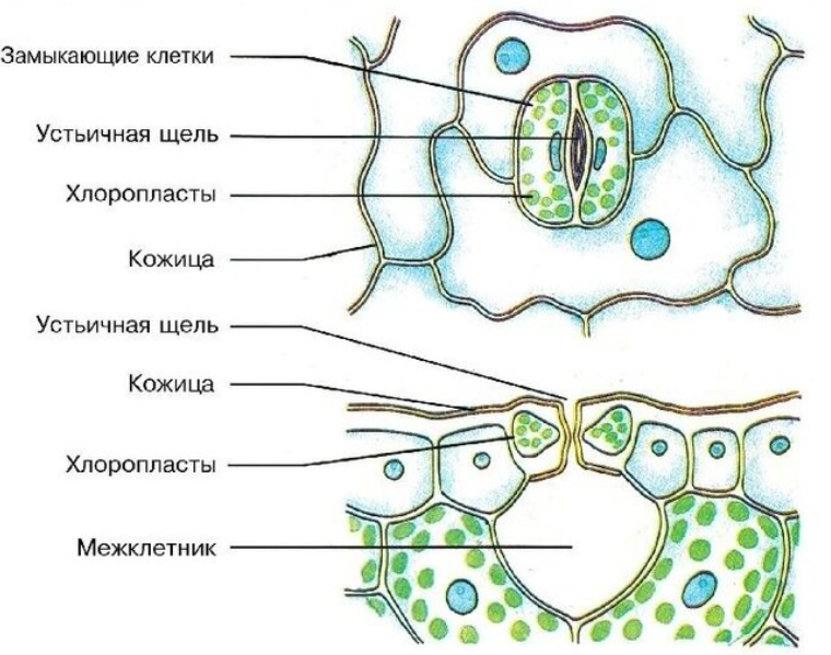 4. Изучите готовые препараты среза листа. Найдите клетки кожицы, устьица, сравните их со своим рисунком.