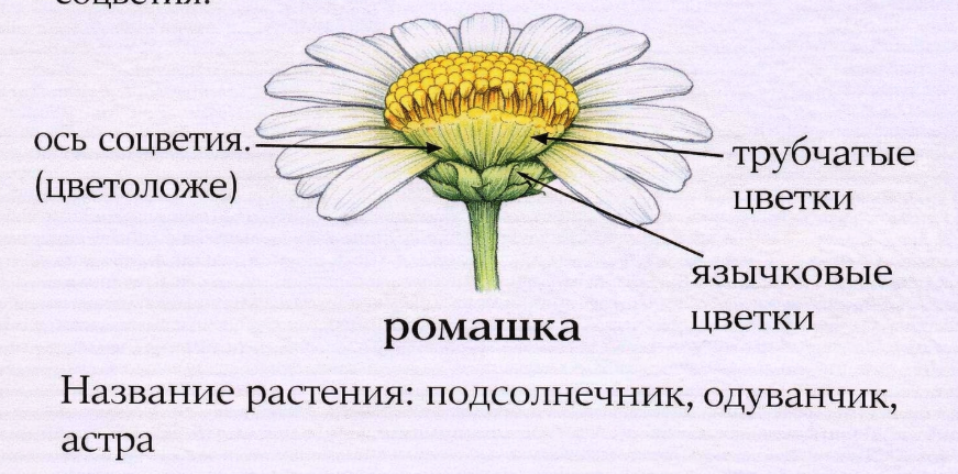 Ось соцветия сильно укорочена и расширена. Цветки расположены плотно, сидят на общем цветоложе. В центре находятся трубчатые цветки, по краям — язычковые.