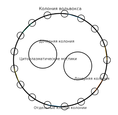 Добавить текст Озвучить Вернуть оригинал5. Зарисуйте колонию вольвокса. Обозначьте на рисунке клетки колонии, цитоплазматические мостики, дочерние колонии.