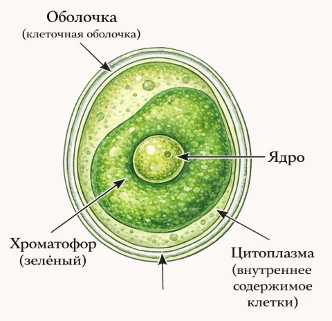 Одноклеточные зелёные водоросли имеют клеточное строение: клеточную оболочку, цитоплазму и ядро, что подтверждает их принадлежность к эукариотам. В клетке присутствует хроматофор (хлоропласт) зелёного цвета с хлорофиллом, благодаря которому водоросль способна к фотосинтезу и образованию органических веществ из неорганических.