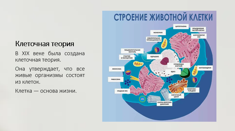 Добавить текст Озвучить Вернуть оригиналВ XIX веке была сформулирована клеточная теория, которая доказала, что клетка является основной структурной и функциональной единицей всех живых организмов. Открытие животной клетки сыграло огромную роль в развитии медицины, биологии и физиологии.