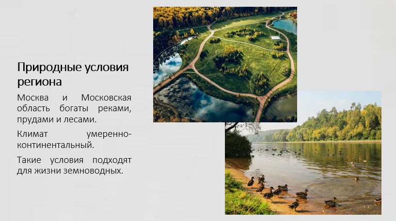 Добавить текст Озвучить Вернуть оригиналМосква и Московская область имеют благоприятные условия для обитания земноводных: здесь распространены реки, пруды, озёра, болота и лесные массивы. Умеренно-континентальный климат с достаточным количеством осадков способствует сохранению влажной среды, необходимой этим животным.