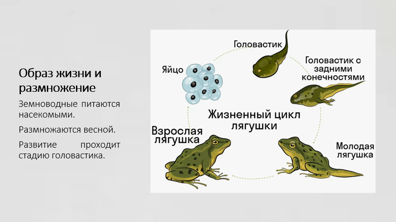 Добавить текст Озвучить Вернуть оригиналЗемноводные ведут в основном ночной образ жизни, питаются насекомыми и другими мелкими беспозвоночными. Весной они собираются в водоёмах для размножения, откладывают икру, из которой развиваются личинки — головастики.