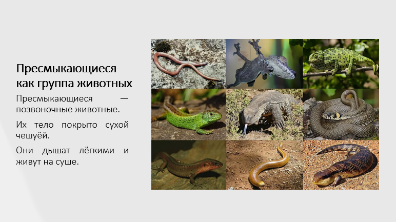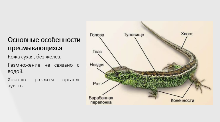Добавить текст Озвучить Вернуть оригиналПресмыкающиеся — это класс позвоночных животных, приспособленных к жизни на суше. Их тело покрыто сухой роговой кожей с чешуёй, что защищает от высыхания. К пресмыкающимся относятся ящерицы, змеи, черепахи и крокодилы.