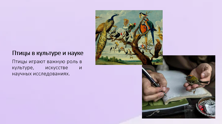 Добавить текст Озвучить Вернуть оригиналПтицы играют важную роль в культуре, искусстве и народных традициях. Их образы широко представлены в литературе, музыке и живописи.