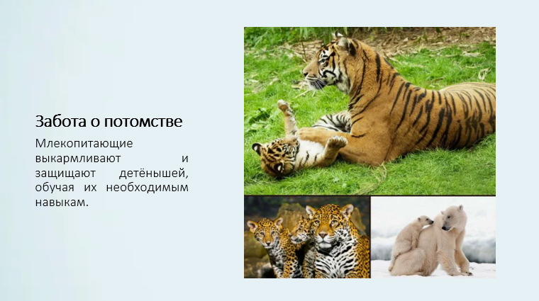 Добавить текст Озвучить Вернуть оригиналОсобое значение имеет забота о потомстве. Млекопитающие выкармливают детёнышей молоком, защищают их и обучают необходимым навыкам выживания.