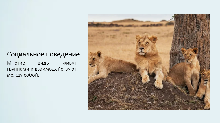 Добавить текст Озвучить Вернуть оригиналДля многих видов характерно социальное поведение. Животные образуют группы, общаются с помощью звуков, жестов и запахов, совместно добывают пищу и защищаются от врагов.