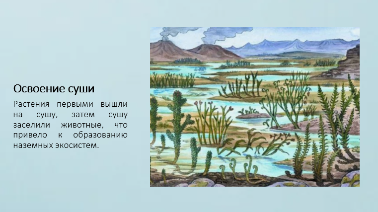 Добавить текст Озвучить Вернуть оригиналСледующим важным этапом стало заселение суши. Растения первыми вышли на сушу, а затем за ними последовали животные. Это привело к формированию разнообразных наземных экосистем.