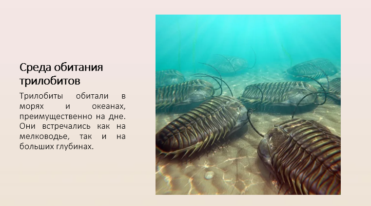 Добавить текст Озвучить Вернуть оригиналТрилобиты жили в морях и океанах и вели преимущественно донный образ жизни. Их тело было покрыто прочным панцирем, который защищал от хищников и неблагоприятных условий среды.
