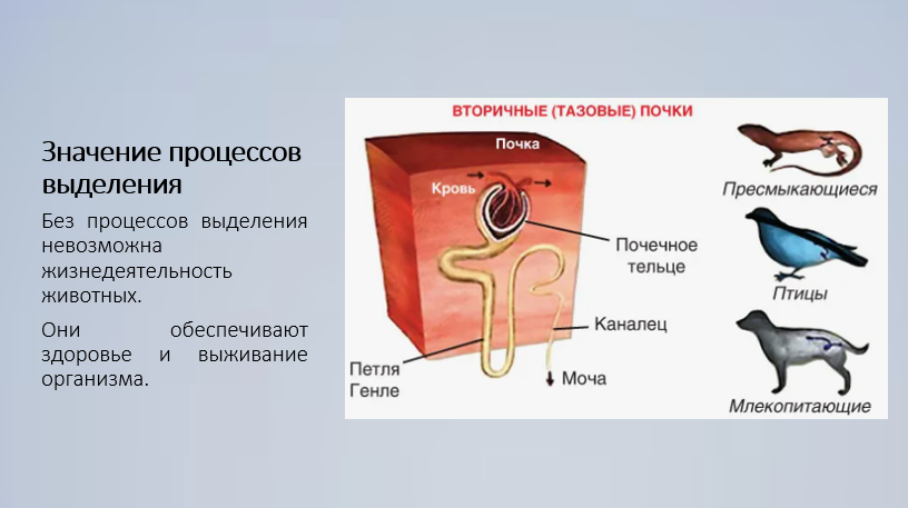 | Пресмыкающиеся, птицы, млекопитающие | Тазовые | Извлекают из крови ненужные продукты обмена веществ, ядовитые вещества и избыток воды. |
