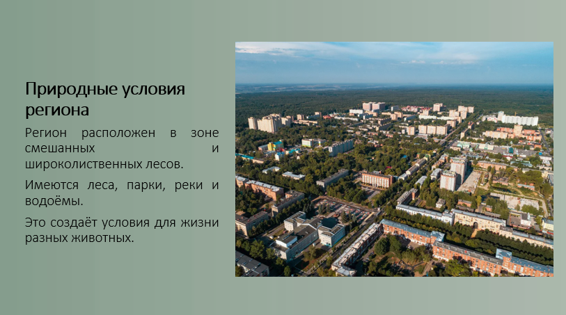 Добавить текст Озвучить Вернуть оригиналТерритория Москвы и Подмосковья расположена в зоне смешанных и широколиственных лесов, что создаёт благоприятные условия для разнообразного животного мира. Несмотря на высокую степень урбанизации, в регионе обитает большое количество видов животных.