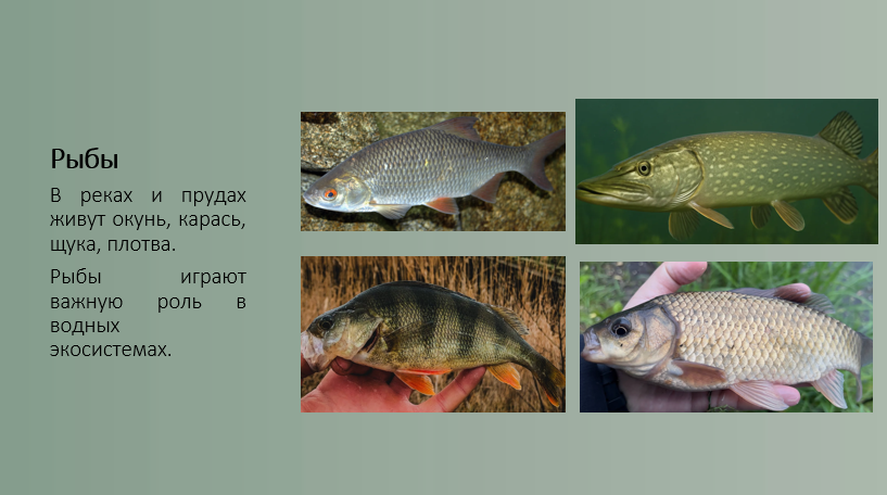 Добавить текст Озвучить Вернуть оригиналИз земноводных встречаются лягушки, жабы и тритоны, а из пресмыкающихся — уж и ящерица. В реках и прудах Москвы обитают карась, окунь, щука, плотва.