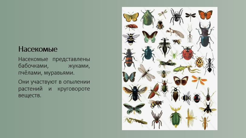 Добавить текст Озвучить Вернуть оригиналНасекомые представлены множеством видов: бабочки, жуки, пчёлы, муравьи, комары. Они играют важную роль в экосистемах.