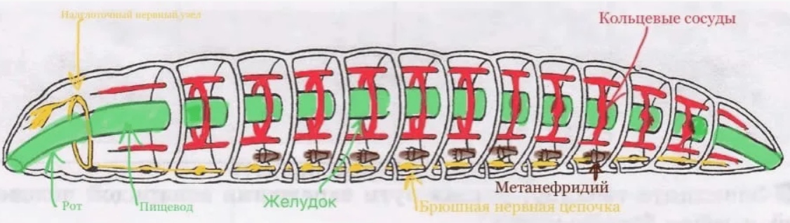 | Кровеносная | Спинной и брюшной сосуды, кольцевые сосуды, капилляры. | Транспорт питательных веществ и газов (кислорода и углекислого газа) ко всем органам. |