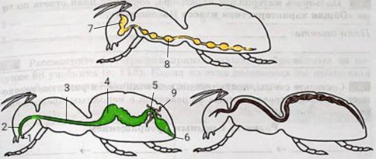 Добавить текст Озвучить Вернуть оригинал2. Раскрасьте внутренние органы насекомого (зеленым цветом — органы пищеварительной системы, красным — органы кровеносной системы, желтым — органы нервной системы, коричневым — органы выделения и половую железу) и подпишите их названия.