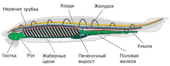 | Скелет | Представлен внутренним осевым стержнем — хордой или позвоночным столбом. |
